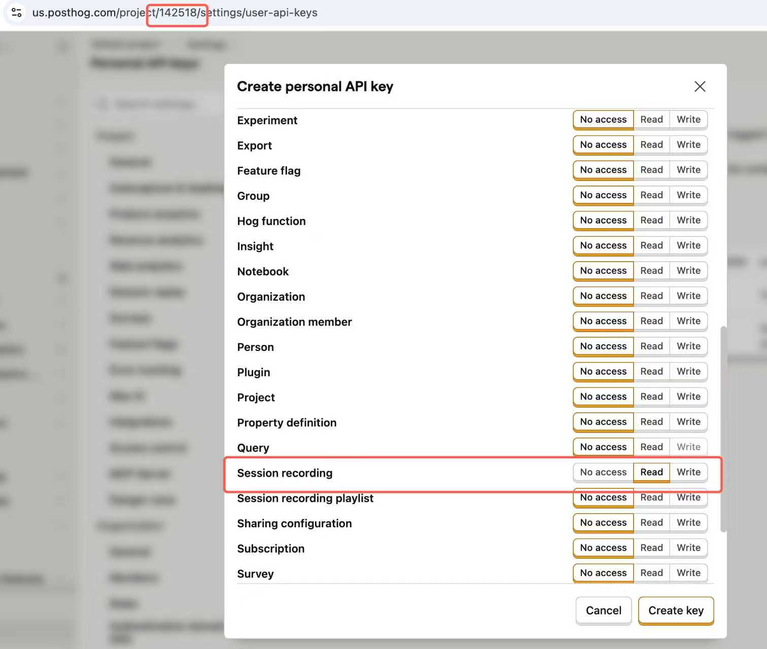 - Go to Settings -> Personal API keys. Click to create a new key and, most importantly, grant it Read access for Session recording. Copy the generated key.