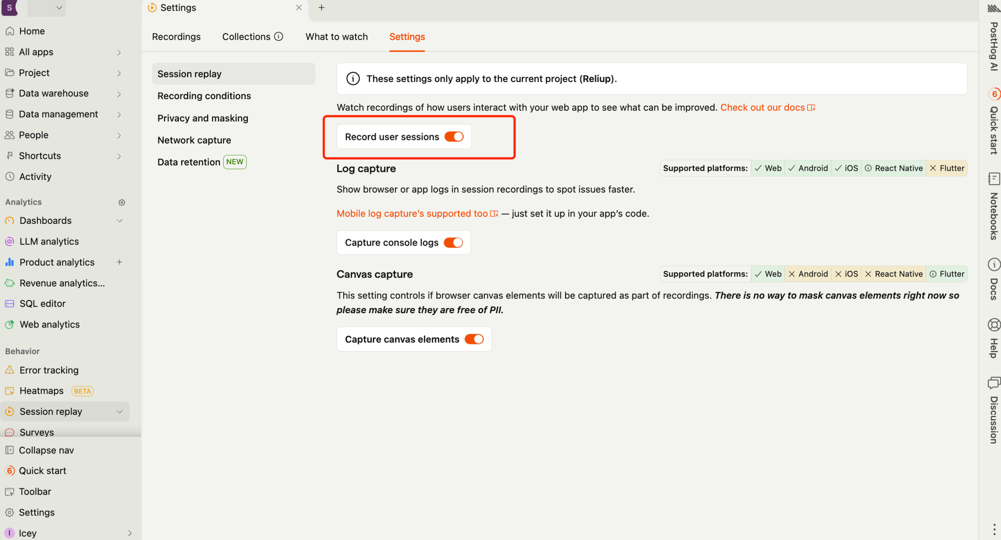 - Navigate to Session Replay -> Settings in your PostHog dashboard and make sure the "Record user sessions" toggle is enabled.