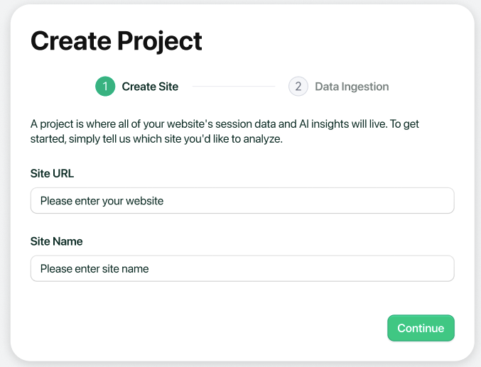 A project is where all of your website's session data and AI insights will live. To get started, simply tell us which site you'd like to analyze.