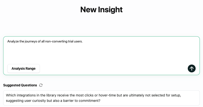 Click to create a new insight. Let's start with something broad but powerful. Type in: "Analyze the journeys of all non-converting trial users." The AI will now sift through all the relevant sessions to identify patterns, friction points, and key drop-off reasons. This may take a few minutes depending on the volume of data.